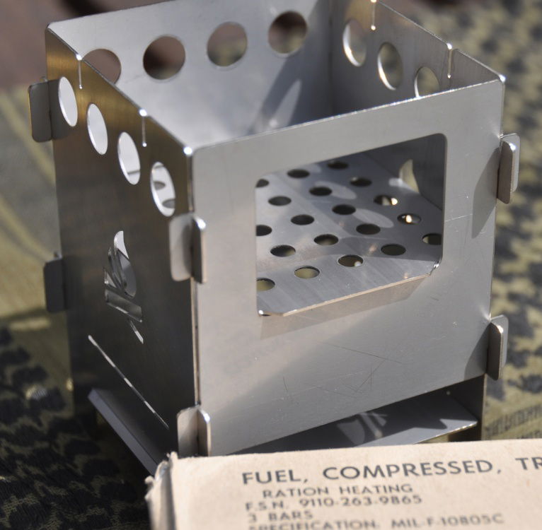 Multi-fuel pocket stove. Can be used with wood, other organic material, a standard Trangia burner or Esbit. Comes with two trivets for any pot size. Can also be used as a windshield/pot support for other burners. Very small and lightweight, fits into any pocket. Comes with an ash pan for soil protection.