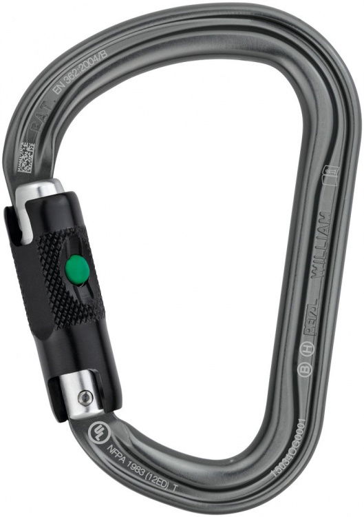 The William asymmetrical large capacity aluminum carabiner has a pear shape that is practical for easily connecting multiple items. Its fluid interior design and Keylock system facilitate manipulations. The William carabiner is available in three locking systems: Screw-Lock manual system or Triact-Lock and Ball-Lock automatic systems.