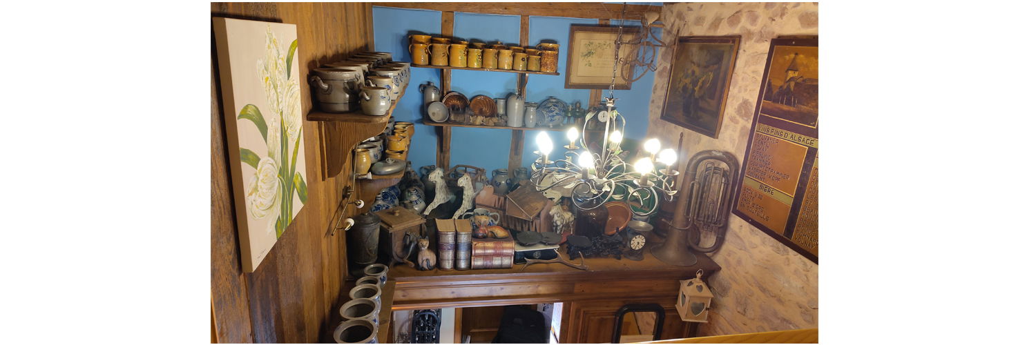 Wir starten die Tour an der sogenannten Haut-Koenigsbourg. Weil es immer noch heiß ist, 36 Grad im Schatten, hat ein Bus uns hinauf gefahren. Die Burg liegt auf einem Gipfel hoch über der Rheinebene, sie ist weithin sichtbar und bietet dementsprechend eine tolle 360 Grad Ausschau. Kaum sind wir ein paar Minuten auf unserem Wanderweg, schon sind wir allein im schattigen Wald. Jedoch: Bereits nach sieben Kilometern ist Schluss für heute. Diese Hitze bin ich nicht gewohnt. Wir biegen ab zu einem alten Melkerhof, der wunderbar renovierte Zimmer vermietet. Um mit der zum Hof gehörigen Border Collie Hündin zu toben, ist es Aneto nicht zu heiß! Selten habe ich eine solche Ansammlung an alten Gegenständen gesehen: Nachttöpfe aus Porzellan, Küchenutensilien, Steingut und vielfältiges Ackergerät.