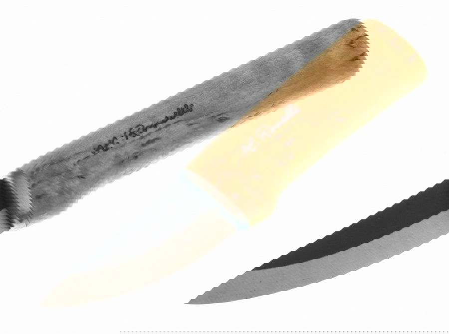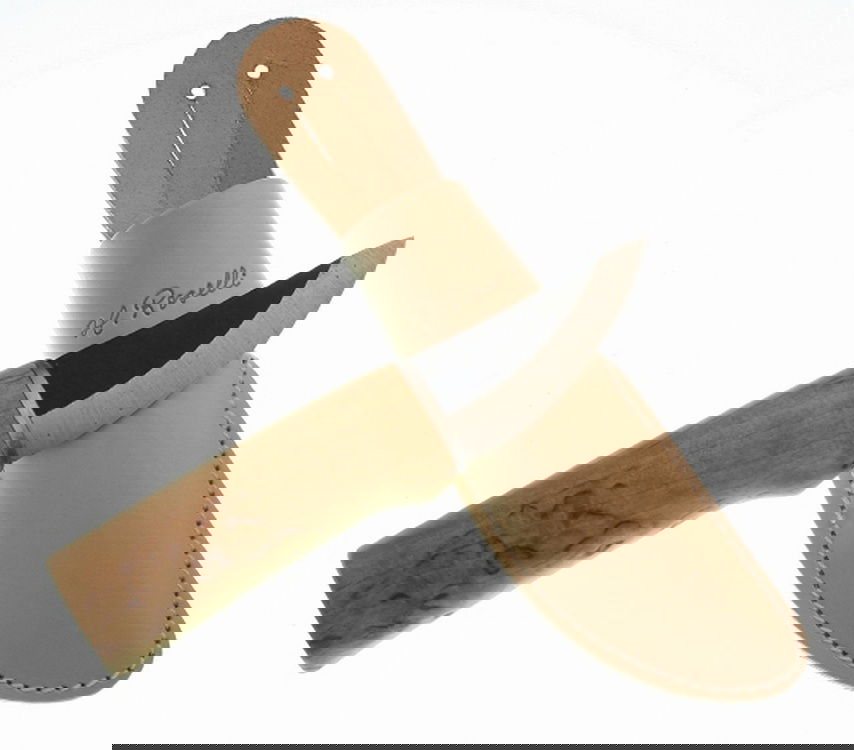 This is the Rosalie Granfather Knife. It is a tough little knife with a razor sharp carbon steel blade. This is a hand forged knife that was made to be used! This knife measures 7" in length with a 2 3/4" blade. The handle is made from kiln dried Arctic Curly Birch. This is a light, tough wood that is warm on the hands in cold weather. There is a heavy duty leather belt sheath that comes with this knife.