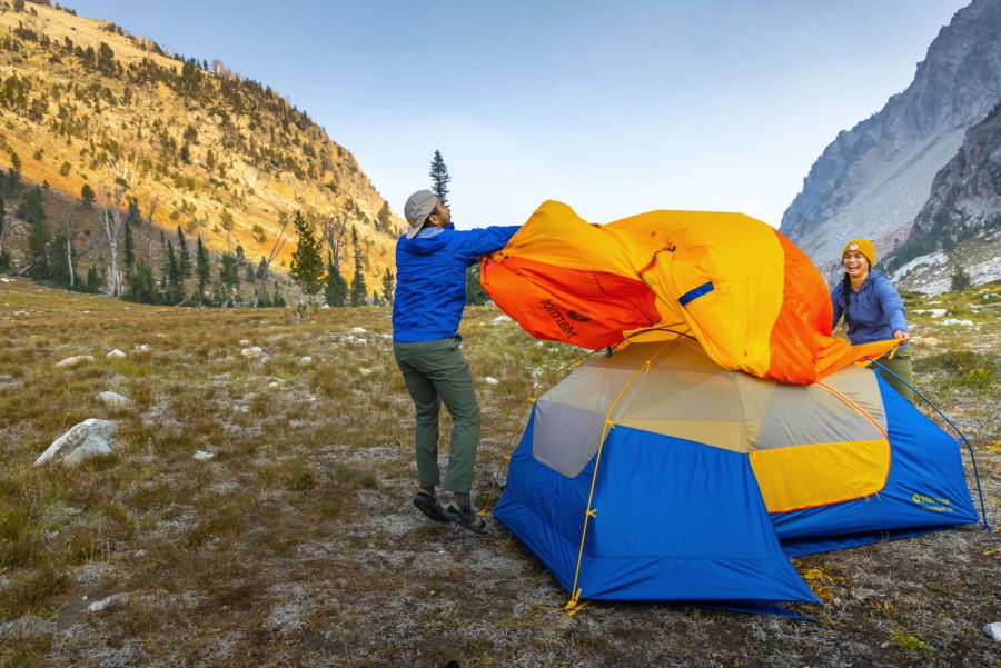 Das Limelight von Marmot ist ein leichtes und unkompliziertes Kuppelzelt für Deine Touren. Ausgepackt, aufgebaut und die Natur genießen - denn durchdachte Details sorgen für einen komfortablen Aufenthalt! Das geräumige Innenzelt kannst Du einfach über die farbcodierten Stangen und Clips aufbauen und das übergeworfene und befestigte Außenzelt sorgt für den notwendigen Wetterschutz. Einen zusätzlichen Schutz vor Nässe bietet der Boden mit hochgezogenen Kanten und getapten Nähten. Im Inneren findest Du mit den seitlichen Innentaschen Platz für kleine Gegenstände Deiner Ausrüstung und die Lampentasche sorgt (mit Deiner Stirn- oder Taschenlampe) für eine angenehme Raumbeleuchtung. Großzügige D-förmige Türen lassen Dich bequem ein- und aussteigen und die beiden Apsiden bieten Platz für Deine Ausrüstung.