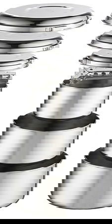 Wenn Du unterwegs die Familie oder eine Gruppe von Freunden bekochen möchtest, bietet das robuste MSR Alpine Guide Topfset Edelstahl von MSR ausreichend Volumen für allerlei Schmackhaftes. Noch dazu gibt es für jeden Topf den passenden Deckel für energiesparendes Kochen, außerdem können sie noch als Teller oder Pfanne benutzt werden. Alle Töpfe und Deckel passen perfekt ineinander, sodass dem Packmaß nicht anzusehen ist, was sich dahinter verbirgt.