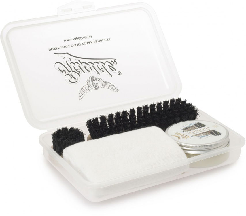 Mit dem Rapide Schuhpflegeset natur haben Sie auch auf Reisen immer geputzte Schuhe! Sie brauchen nur die praktische kleine Box einpacken, in der alles Wichtige für die Schuhpflege enthalten ist: Wachs für alle Glattleder- und Nubuklederschuhe, eine Cremebürste, eine Glanzbürste und ein weiches Tuch.