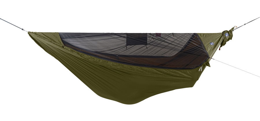 Das integrierte und verstaubare Moskitonetz schützt Dich vor störenden Insekten, während Du entspannt in Deiner Pro Hammock Hängematte zur Ruhe kommst. Außerdem lenkt das feinmaschige Gewebe den Wind ab und schafft einen ruhigeren Innenraum. Mit der integrierten "Ridgeline", die oberhalb der Liegefläche gespannt ist, behält Deine Hängematte immer die gleiche komfortable Form bei und hält Deinen Rücken gerade, wenn Du diagonal schläfst. Der Organizer, der an der Schnur befestigt ist, bietet Dir Platz für Ausrüstung, die Du nachts benötigst, oder das Moskitonetz.