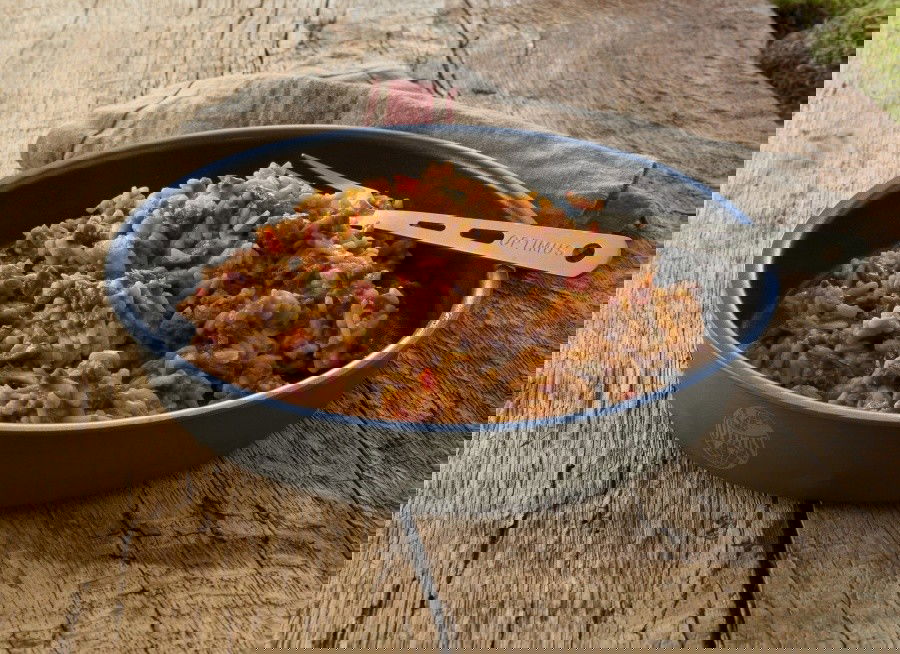 Bei diesem Produkt wurde den Zutaten durch Gefriertrocknen das Wasser entzogen. Auf diese Weise wird es haltbar gemacht und es bleiben der Outdoornahrung nahezu alle wertvollen Inhaltsstoffe wie Vitamine, ätherische Öle oder Mineralien erhalten. Während der Zubereitung nehmen die Zutaten das Wasser wieder auf und sorgen so für eine schmackhafte Mahlzeit. Auch wenn durch dieses Verfahren die meisten natürlichen Aromen erhalten bleiben, kommt dieses Produkt nicht ohne Geschmacksverstärker aus. Bitte beachte, dass in dem natürlich klingenden Hefeextrakt Glutamat enthalten ist.